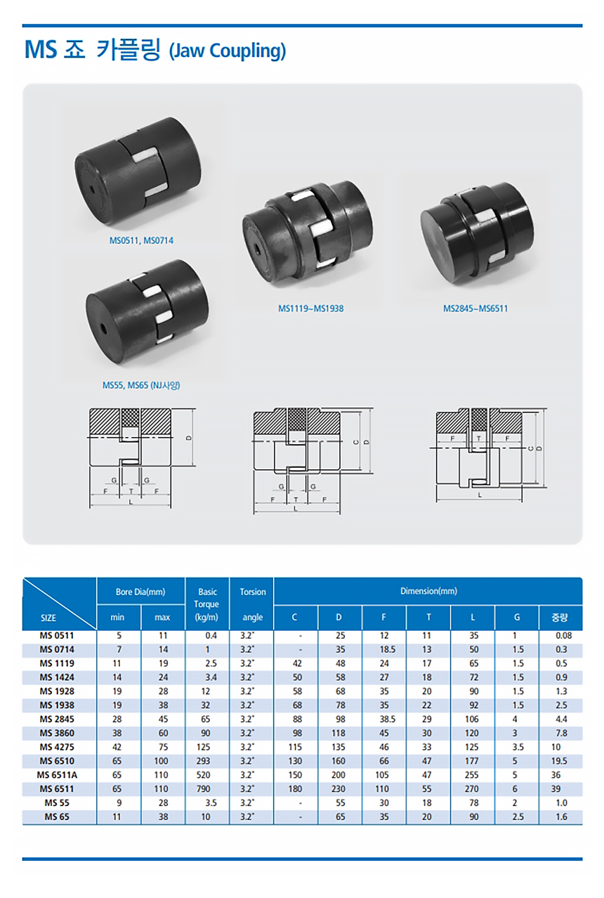 죠 커플링 중간에 삽입되는 우레탄 재질의 스파이더를 사용하여 비틀림강성이 크게 디자인 됨 그에 따라 충격완화, 소음 및 진동흡수 능력이 우수합니다. 스파이더의 재질특성으로 강하면서도 뛰어난 신축성 및 반발탄성을 가짐 최대 5˚ 의 비틀림각까지 압축하중을 견딜 수 있습니다. 구조가 간단하고 전동능력에 비해 소형 입니다. 윤활유 급유가 필요 없습니다.